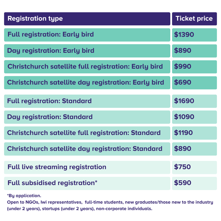 Christchurch satellite hub: Please note that registrations for the Christchurch Satellite Hub include day catering, name badge, access to the conference event app and delegate attendees, all plenary sessions and sessions in Stream A and Stream B. Due to the nature of the sessions in Stream C, these are not able to be livestreamed.